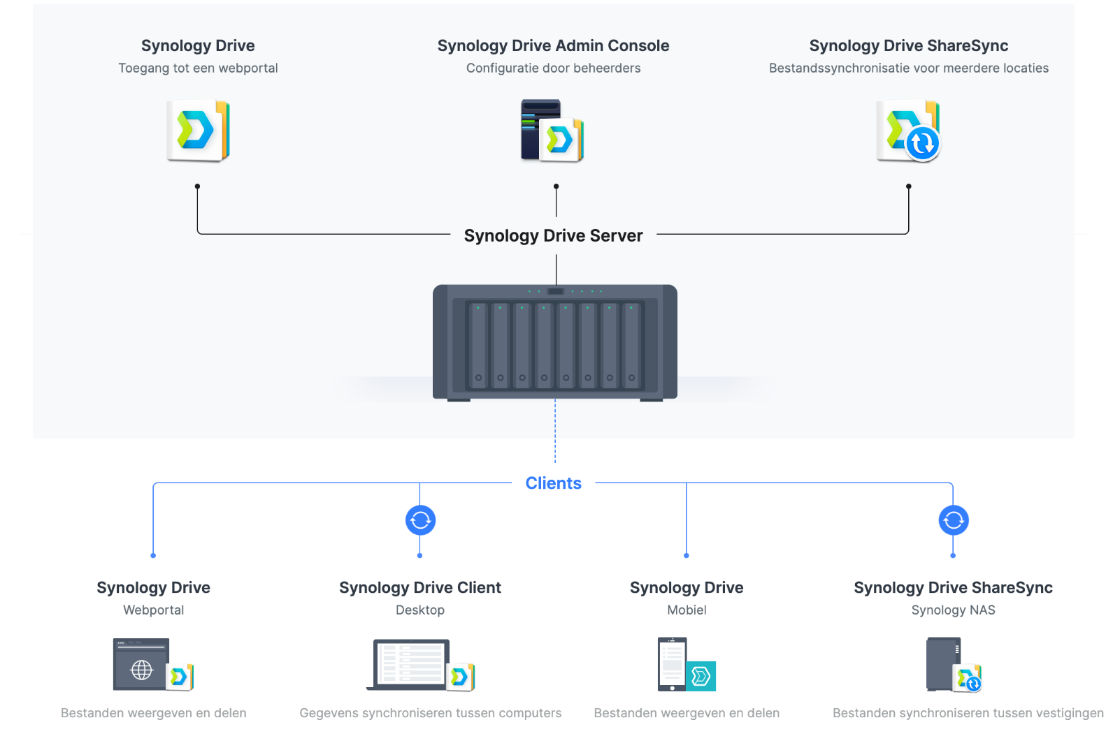 Synology stelt elk bedrijf, eenmanszaak of particulier op een unieke manier in staat om gegevens te beheren, beveiligen en beschermen op de plaats waar ze nodig zijn – of ze nu op een flashgeheugen, schijf of meerdere cloudplatformen staan.